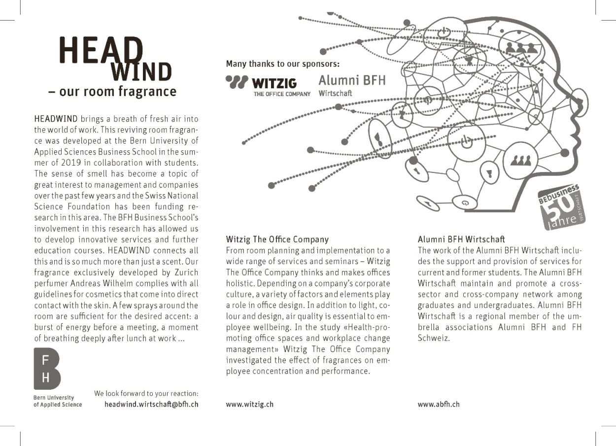 This reviving room fragrance was developed at the Bern University of Applied Sciences Business School in the summer of 2019. The sense of smell has become a topic of great interest to management and companies over the past few years and the Swiss National Science Foundation has been funding research in this area. The BFH Business School’s involvement in this research has allowed us to develop innovative services and further education courses. HEADWIND connects all this and is so much more than just a scent. The fragrance exclusively developed by Zurich perfumer Andreas Wilhelm complies with all guidelines for cosmetics that come into direct contact with the skin. A few sprays around the room are sufficient for the desired accent: a burst of energy before a meeting, a moment of breathing deeply after lunch at work ...