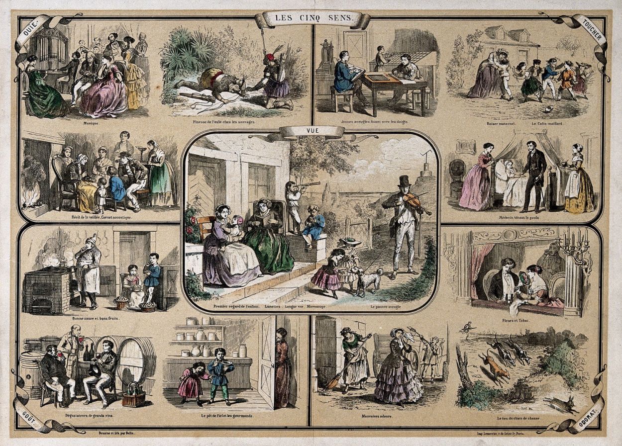 The five senses: sight, surrounded by vignettes showing the other senses coloured lithograph by Belin.