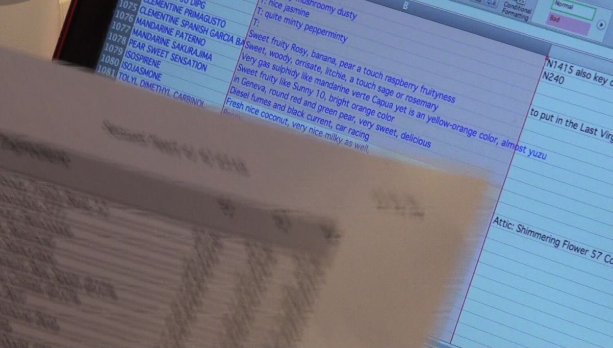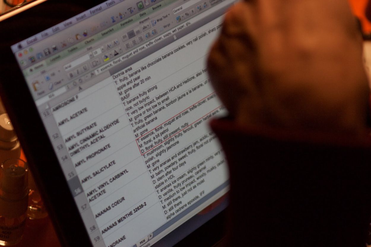 Short entries in a spreadsheet capture descriptive remarks as well as similarities and comparisons between different materials. In this way a perfumer systematically builds up a network of associations that serve various purposes throughout a professional career. In the case of Christophe Laudamie, we often encountered how he maintained his knowledge base and made note of many new surprises by documenting them in his spread sheet. When searching for possible ingredients Christophe searches through the spreadsheet: «Papery» shows up roughly 30 times. Christophe narrows this down to a shortlist of 5-10 ingredients. He then goes to the lab: «Each bottle contains a whole world - a world by itself», Christophe once remarked. This video shows how Christophe explores the worlds of a few bottles and engages in a conversation with the materials on the shelves.