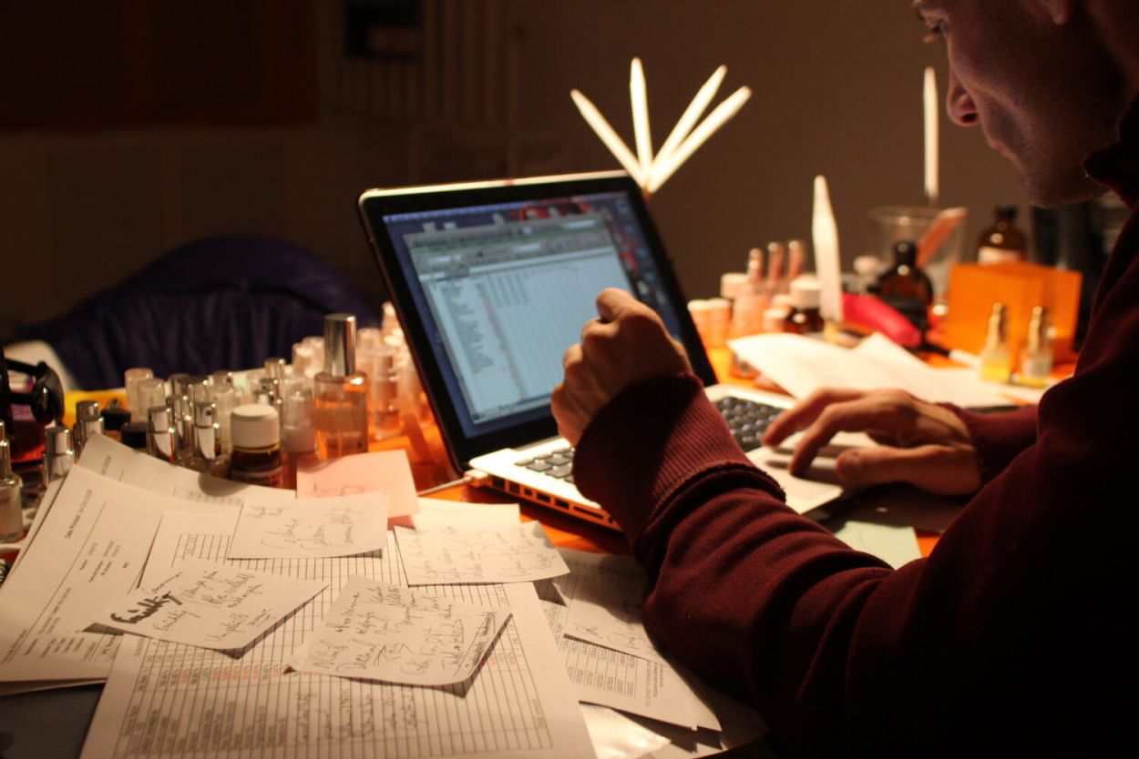 At its core, the practice of perfumery has not changed very much since Renaissance times. The process can be described along a sequence of clearly defined steps: The perfumer starts with some vague ideas which are evoked by certain olfactory ingredients. Thereafter, this rather open process is narrowed down to a precise formula determining the perfume composition in quantitative terms - how much of each material is needed to achieve the ideal balance. Accordingly, the formula is precisely weighed in the laboratory. Each step is accurately documented on a spreadsheet. Using paper strips the perfumer smells and evaluates the scent. Alternative variations are analyzed. The formula is then modified based on detailed analysis. This sequence of steps is repeated until the olfactory experience meets the expectations of the perfumer: Calculating the formula, weighing, evaluating & analyzing.