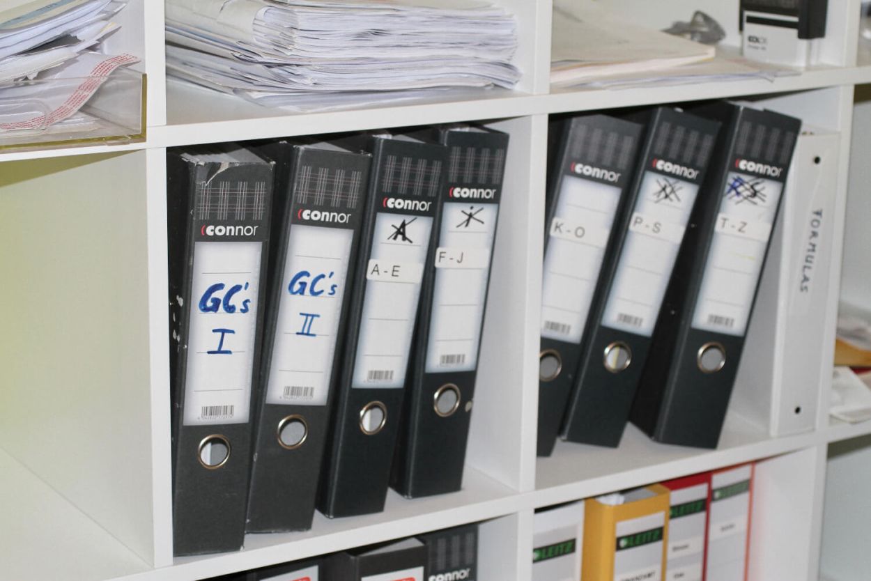 Some folders on a shelf at Dreamair. The label «GCs» might stand for gas chromatography. We have never seen anybody opening the folders.