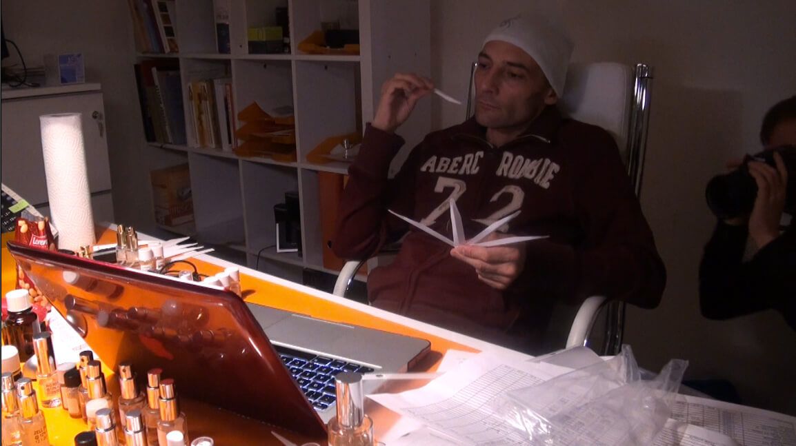 There is no one «natural», «correct» or even «objective» way for writing fieldnotes. Instead, depending on the researcher’s perception and interpretation, descriptions of the same situation can greatly differ. Yet, some observations are more compelling than others. Given our background in social and organization studies, the field of perfumery was completely new to us. Here is an excerpt from an early fieldnote Claus wrote when following Christophe’s silent practice as shown on this clip: