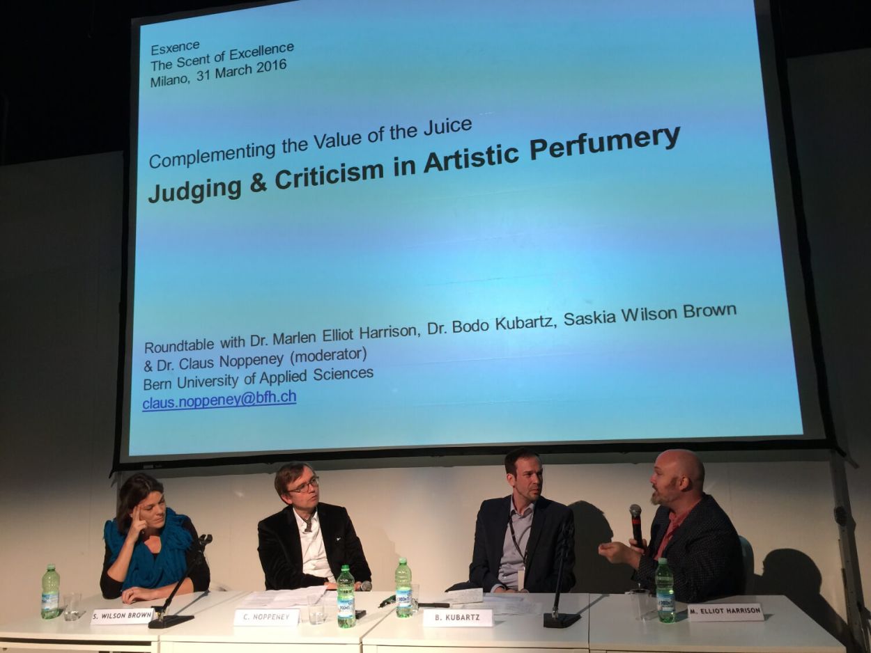 A discussion on the value of judging and criticism in perfumery at the Esxence tradefair, Milano. A panel with Saskia Wilson-Brown, Bodo Kubartz, Marlen Harrison initiated by Claus Noppeney.