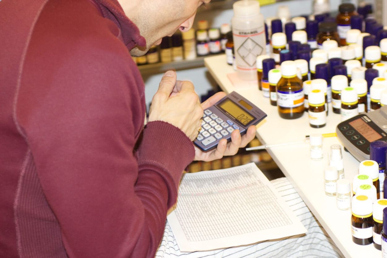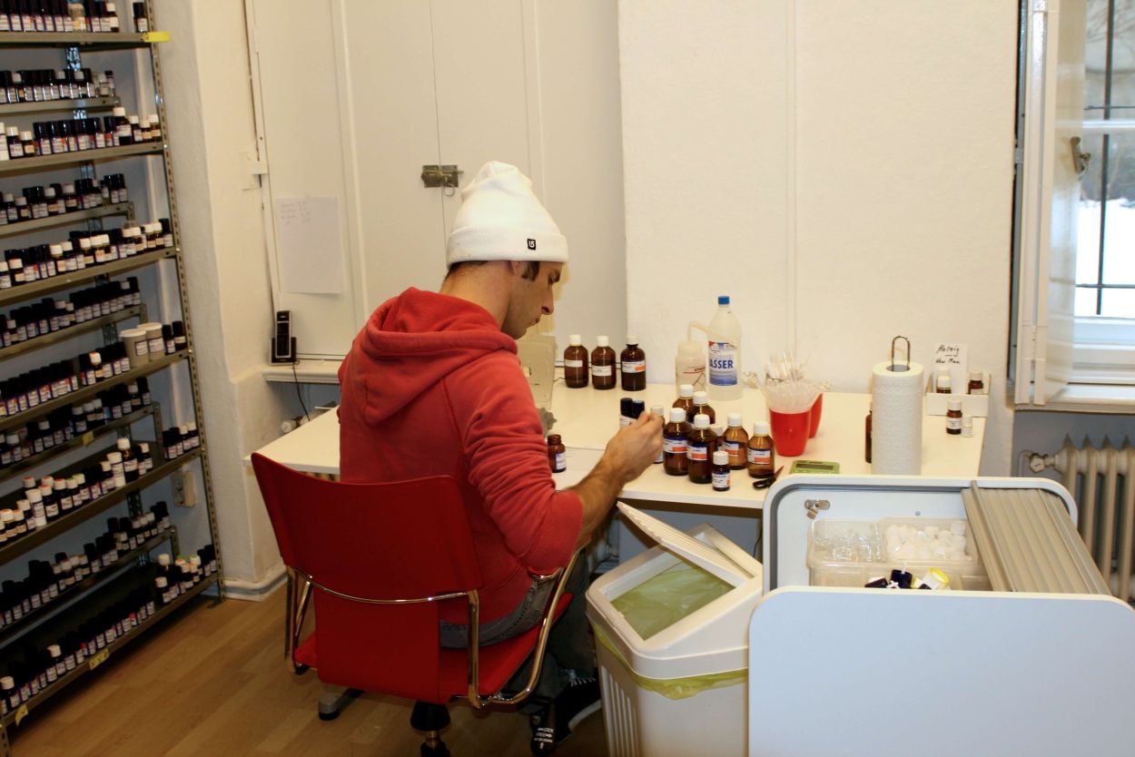 Perfumery is practiced in a lab. The lab serves several functions. It is a storage space for the ingredients that are alphabetically shelved. More sensitive materials are kept in a designated refrigerator in the lab. Moreover, the lab provides specific tools and equipment (e.g. scientific scales). As a special workplace the lab is the place for creating solutions of solid materials or weighing formulae. The lab also serves as the perfumer’s archive where modifications of completed projects are stored. All in all, the lab provides access to the world of the volatile molecules. While observing Christophe’s creative process we were surprised how often he went to the lab to reconnect to his material base.