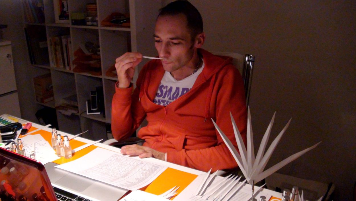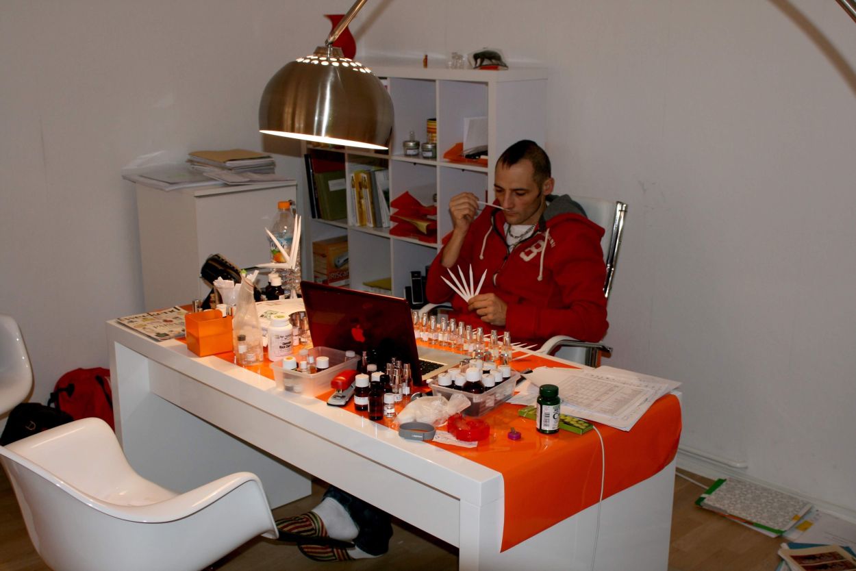 Christophe Laudamiel analyzing a set of modifications. There is a video documenting this type of work further.