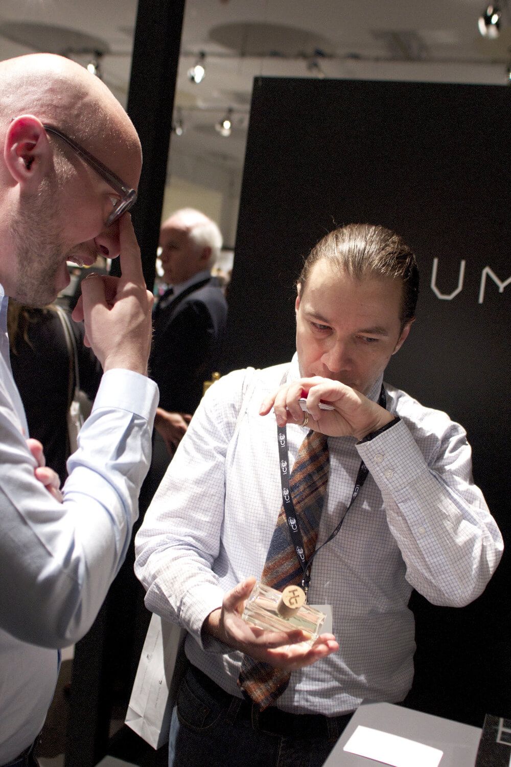 Sergey Borisov, editor and columnist with Fragrantica, smelling at the Humiecki & Graef booth at Esxence in Milano.