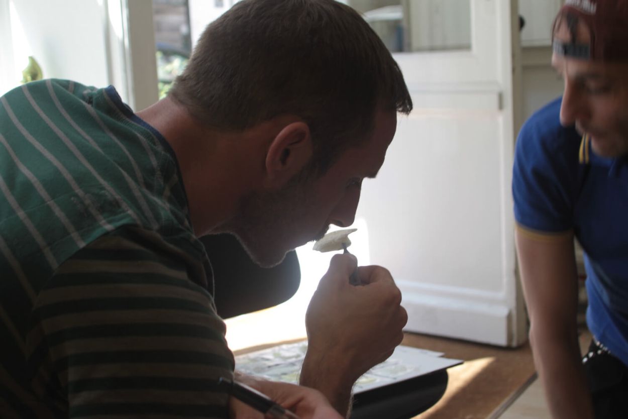 There is no one «natural», «correct» or even «objective» way for writing fieldnotes. Instead, depending on the researcher’s perception and interpretation, descriptions of the same situation can greatly differ. Yet, some observations are more compelling than others. Given our background in social and organization studies, the field of perfumery was completely new to us. Here is an excerpt from an early fieldnote Claus wrote when following Christophe’s silent practice as shown on this clip: