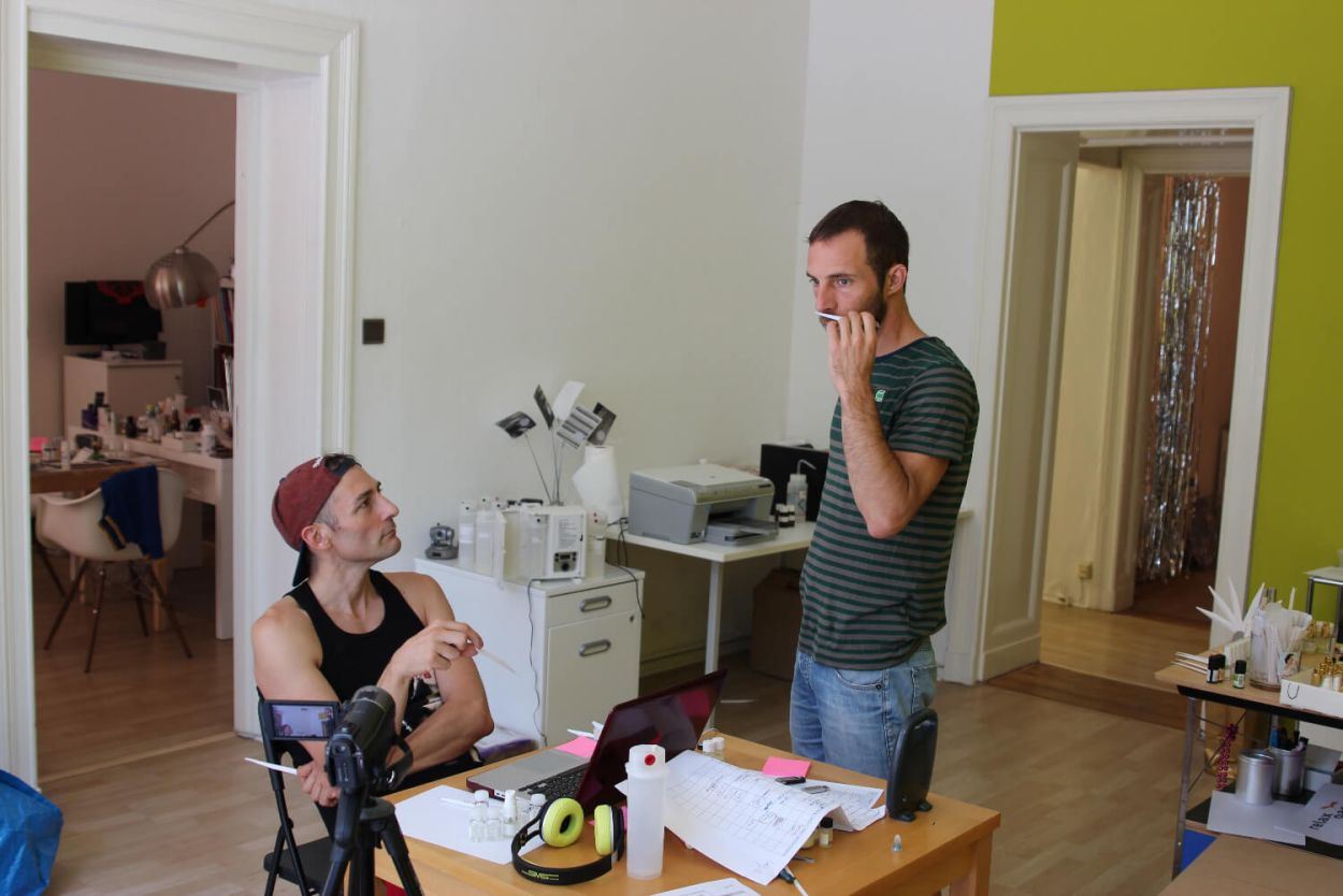 Christoph Hornetz evaluating different resins as a material base. The resins are later used when trying to smell pepper.