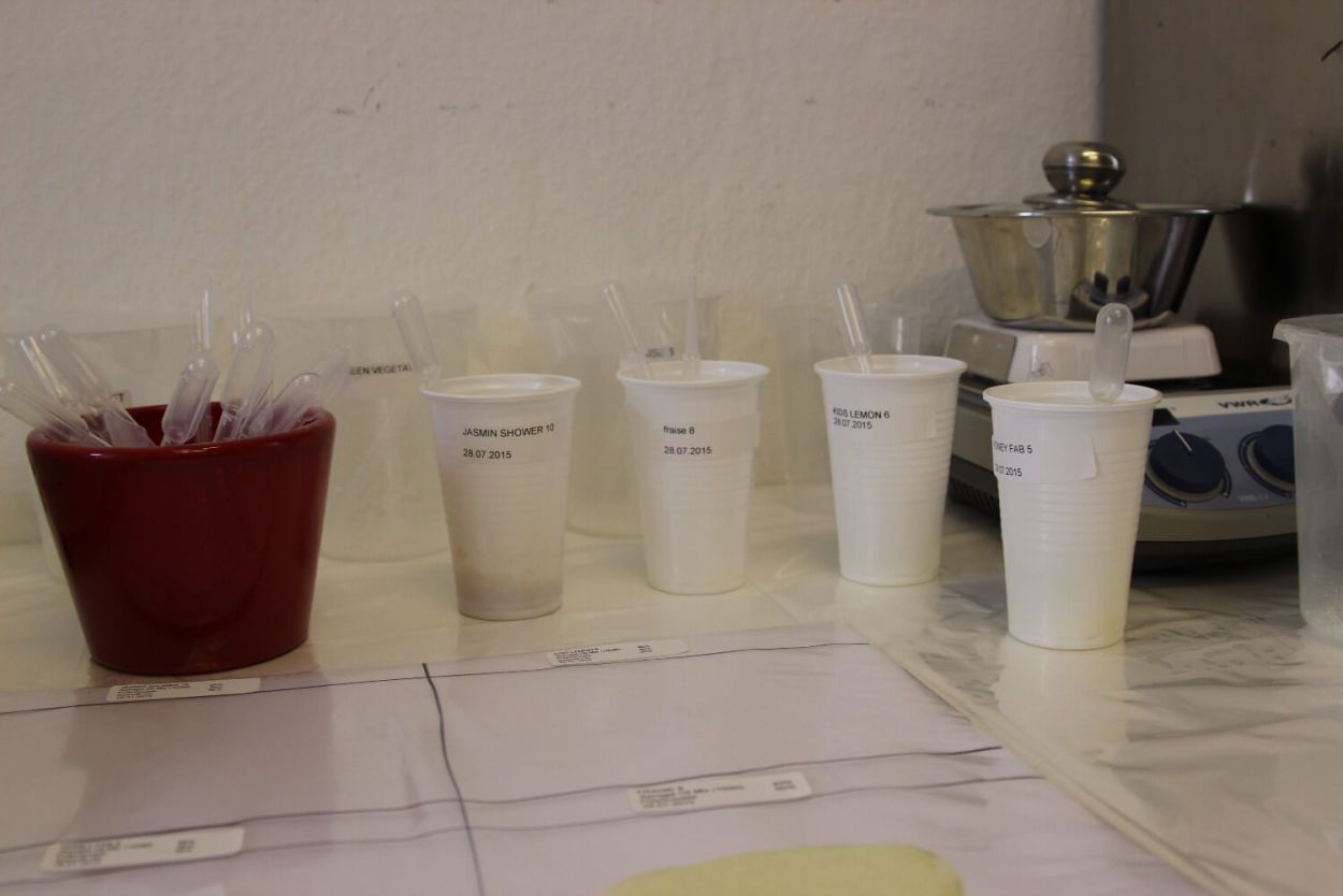 Perfumery is practiced in a lab. The lab serves several functions. It is a storage space for the ingredients that are alphabetically shelved. More sensitive materials are kept in a designated refrigerator in the lab. Moreover, the lab provides specific tools and equipment (e.g. scientific scales). As a special workplace the lab is the place for creating solutions of solid materials or weighing formulae. The lab also serves as the perfumer’s archive where modifications of completed projects are stored. All in all, the lab provides access to the world of the volatile molecules. While observing Christophe’s creative process we were surprised how often he went to the lab to reconnect to his material base.